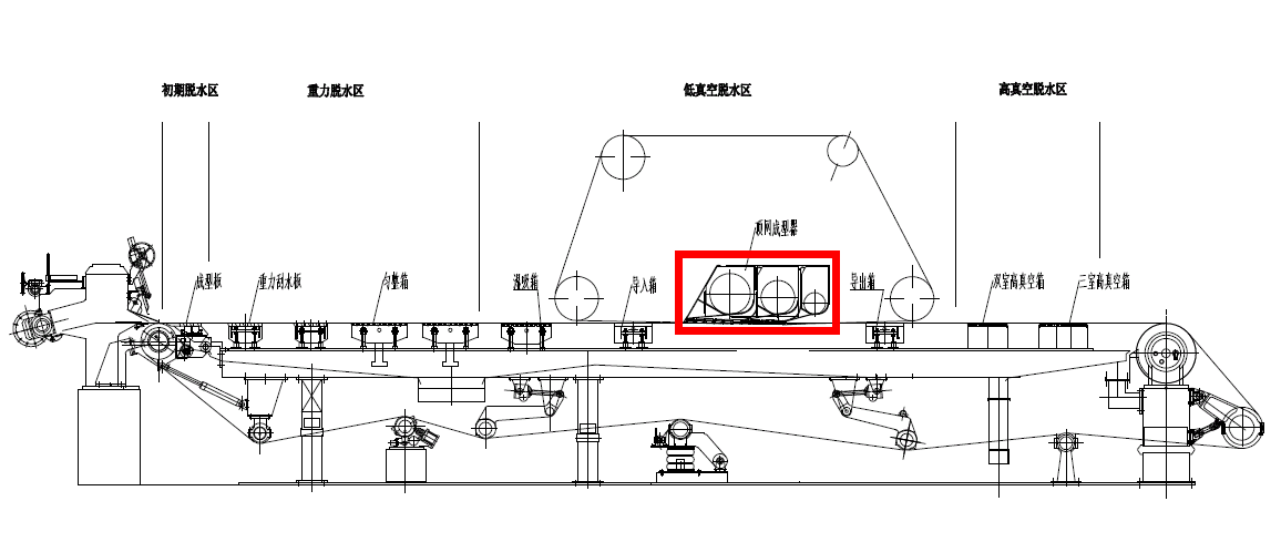 La parte más importante de la formadora superior es su caja de succión con una capacidad de vacío diversa y valores de depresión que aumentan gradualmente. Debajo de la segunda cámara de la caja de succión y debajo del alambre inferior hay una caja formadora instalada con barras regulables en altura y controladas neumáticamente para mejorar la formación del papel sobre el alambre. Detrás de la cámara de formación, hay una caja de succión que mantiene la banda de papel en el alambre inferior en el lugar de la división del alambre superior e inferior.